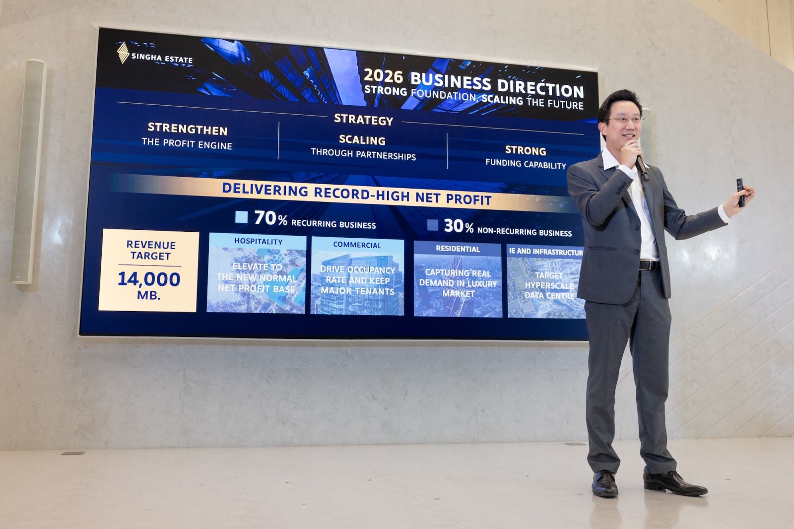 บริษัท สิงห์ เอสเตท จำกัด (มหาชน) หรือ S ผู้พัฒนาและลงทุนในอสังหาริมทรัพย์ระดับสากล ประกาศแผนธุรกิจปี 2569 “STRONG FOUNDATION, SCALING THE FUTURE” ชูรากฐาน 4 ธุรกิจแกร่ง ขับเคลื่อนการเติบโตอย่างยั่งยืน เดินหน้าเสริมฐานกำไรจากธุรกิจรายได้ประจำ ขยายการเติบโตผ่านพันธมิตรเชิงกลยุทธ์ และรักษาวินัยทางการเงิน เตรียมพัฒนาและรีแบรนด์สินทรัพย์เดิมเพื่อยกระดับมูลค่า ตั้งเป้ารักษาสัดส่วนรายได้ประจำ 70% ของพอร์ต หนุนรายได้รวมทั้งปีทะลุ 14,000 ล้านบาท มุ่งสร้างฐานกำไรเชิงคุณภาพ
