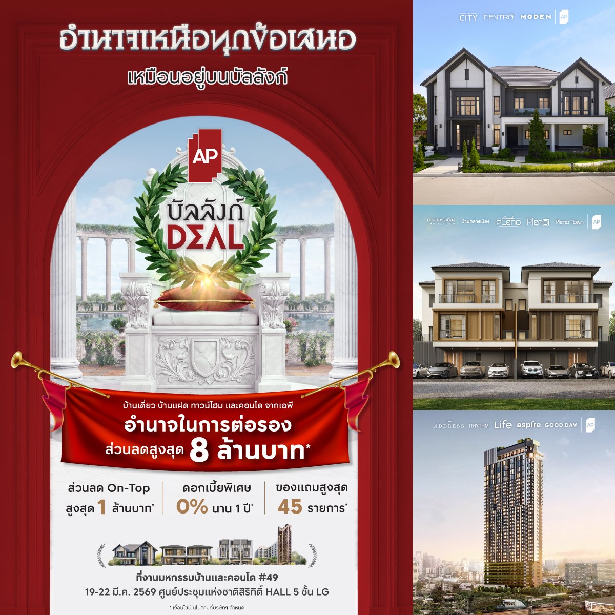 พบกันที่ บูธ AP #บัลลังก์DEAL ณ ฮอลล์ 5 ชั้น LG ศูนย์การประชุมแห่งชาติสิริกิติ์ เฉพาะวันที่ 19 - 22 มีนาคม 2569 นี้เท่านั้น!