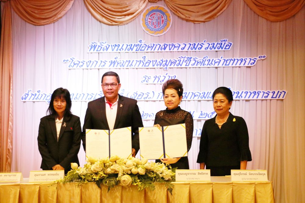 สำนักงานอุทยานการเรียนรู้ โดยนายราเมศ พรหมเย็น รักษาการรองผู้อำนวยการสำนักงานบริหารและพัฒนาองค์ความรู้และผู้อำนวยการสำนักงานอุทยานการเรียนรู้ ได้ลงนามบันทึกข้อตกลงความร่วมมือ “โครงการพัฒนาห้องสมุดมีชีวิตในค่ายทหาร” ร่วมกับสมาคมแม่บ้านทหารบก นำโดย นางเบญจวรรณ สิทธิสาท นายกสมาคมแม่บ้านทหารบก เพื่อร่วมมือกันส่งเสริมและสร้างสรรค์แหล่งเรียนรู้ภายใต้แนวคิดห้องสมุดมีชีวิต ให้เกิดขึ้นในค่ายทหารทั่วประเทศ
