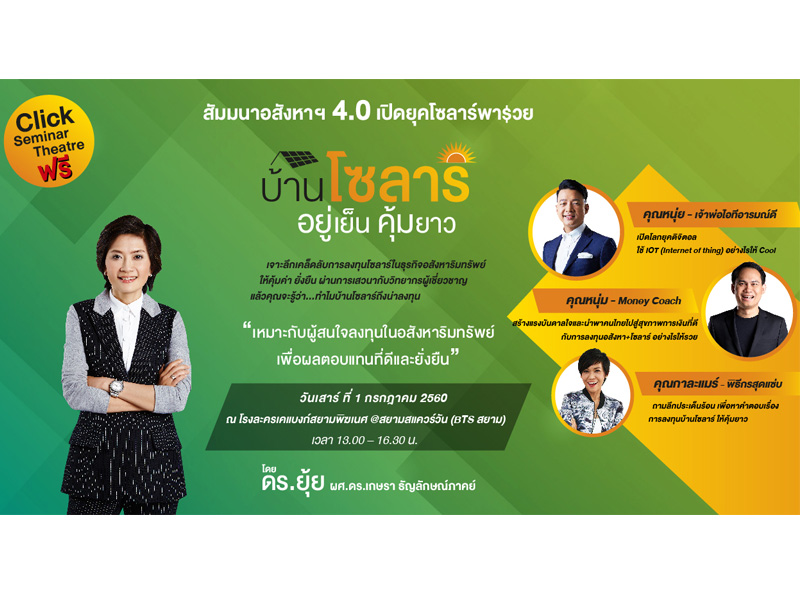 ชีวิตดีไปอีก งานสัมมนาฟรี ไม่พอพารวยอีกด้วย สำหรับใครที่กำลังมอบหาโอกาสในการลงทุนกับอสังหาฯ ไม่ควรพลาด กับการเสวนาที่มีกรูรูผู้เชี่ยวชาญเฉพาะด้าน ผศ.ดร. เกษรา ธัญญาลักษณ์ภาคย์ นักธุรกิจหญิงแกร่งแห่งวงการอสังหาฯ พร้อม เจ้าพ่อ IT อารมณ์ดี อย่างคุณหนุ่ย ที่จะพูดเรื่อง Internet of thing อย่างไรให้ cool , คุณหนุ่ม Money coach ผู้สร้างแรงบันดาลใจและนำพาคนไทยสู่สุขภาพการเงินที่ดี กับการลงทุนอิสังหาฯ โซลาร์ ให้ร่ำรวย และพิธีกรสาวที่มีฝีปากแซ่บ อย่างคุณกาละแมร์ พัชรศรี จะมาร่วมหาคำตอบ เจาะลึก กับการลงทุนบ้านโซลาร์ ให้คุ้มยาว