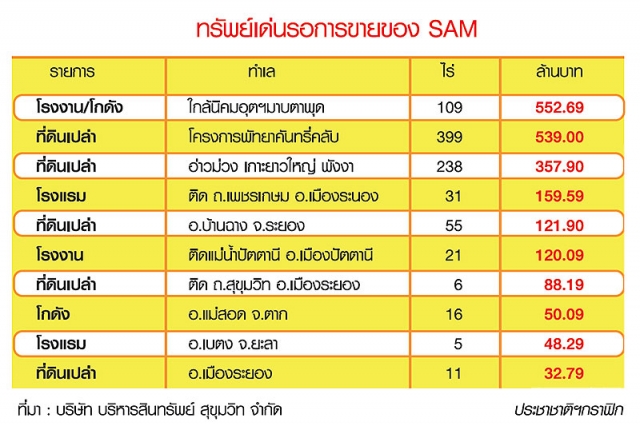 โดย SAM มีพอร์ตทรัพย์รอการขายตอนต้นปีรวม 2 หมื่นล้านบาท สามารถจำหน่ายได้ 3,000-4,000 ล้านบาท โดยมี NPA เข้ามาเติมในพอร์ตอยู่เรื่อย ๆ พอร์ตเดิมลดน้อยลงไปในการปรับโครงสร้างหนี้ แต่พอร์ตใหม่เนื่องจากเป็นหนี้บ้านพักอาศัย ถ้าเจ้าของเดิมขายได้ก็มาปิดบัญชี แต่วันนี้ให้โอกาสในการผ่อนชำระกับ SAM มากขึ้นเพื่อรอการรีไฟแนนซ์