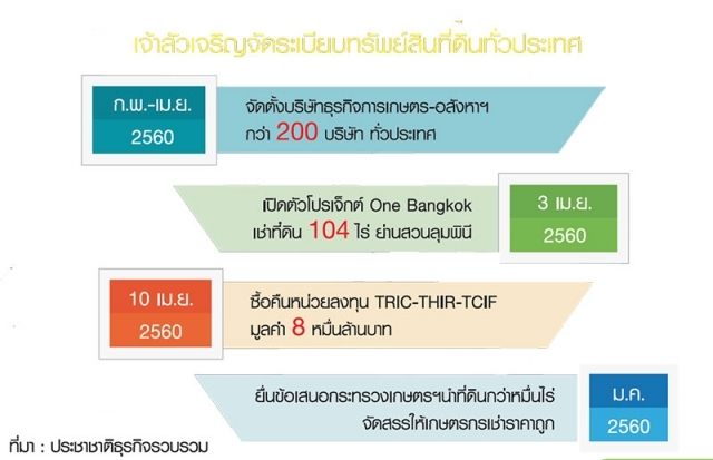 เจ้าสัวเจริญรื้อกรุที่ดิน-อสังหาฯ จัดพอร์ตบริหารใหม่ รับ พ.ร.บ.ภาษีที่ดินและสิ่งปลูกสร้างฯ แห่ยื่นขอจดทะเบียนจัดตั้งบริษัทนิติบุคคลแค่เดือนเดียว 178 บริษัท กระจายการถือครองแลนด์แบงก์ที่กว้านซื้อตุนเก็บไว้เหนือจรดใต้ ตั้งทีมคุมบริหารเป็นรายกลุ่มธุรกิจ รายทำเล ชูธงพัฒนาอสังหาฯ แหล่งท่องเที่ยว เกษตรเชิงศิลปวัฒนธรรม พับแผน "เกษตรประชารัฐ" นักกฎหมายชี้ช่วยลดภาระภาษีที่ดิน-มรดก แยกธุรกรรมไม่ให้โยงถึงบริษัทแม่