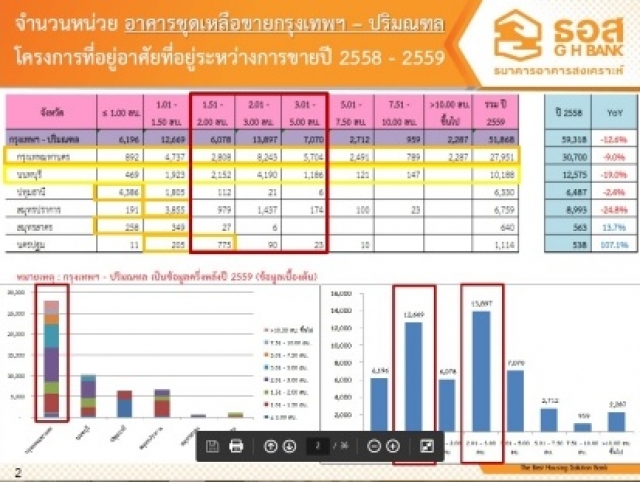 ทั้งนี้ จากการสำรวจพบว่า หน่วยเหลือขายอาคารชุด ในเขตกรุงเทพฯ และปริมณฑล ยอดสำรวจ ณ 31 ธันวาคม 2559 กลุ่มราคา 2-3 ล้านบาทเหลือขายมากสุด 13,897 หน่วย, ราคา 3-5 ล้านบาท มีหน่วยเหลือขาย 7,070 หน่วย ชี้ให้เห็นว่าหน่วยเหลือขาย 2-5 ล้านบาทเป็นกลุ่มราคาที่มีหน่วยเหลือขายจำนวนมากอย่างมีนัยสำคัญ (ส่วนใหญ่เป็นราคาของตลาดเรียลดีมานด์ ลูกค้าหลักส่วนหนึ่งมาจากมนุษย์เงินเดือน) หรือเท่ากับเหลือขายรวมกัน 20,967 หน่วย