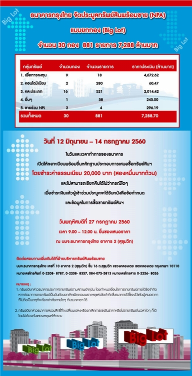 นายชัยชาญ พลานนท์ ผู้ช่วยกรรมการผู้จัดการใหญ่ ผู้บริหารกลุ่ม กลุ่มบริหารทรัพย์สินพร้อมขาย บมจ.ธนาคารกรุงไทย ประกาศจัดประมูลทรัพย์สินพร้อมขาย (NPA) แบบยกกอง (Big Lot) จำนวน 30 กอง 881 รายการ 7,288 ล้านบาท โดยนำกลุ่มทรัพย์เพื่อการลงทุน คอนโดมิเนียม ทรัพย์คละประเภท และทรัพย์อื่นๆ ครอบคลุมทำเลเด่นๆ ทั่วประเทศ มาเปิดประมูล เปิดให้ลงทะเบียนตั้งแต่วันนี้ถึง 14 กรกฎาคม 2560 กำหนดยื่นซองเสนอราคา ในวันที่ 27 กรกฎาคม 2560