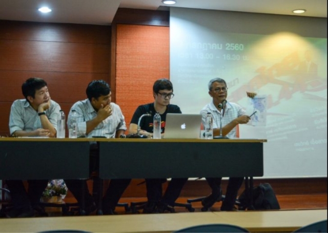 วันที่ 2 กรกฎาคม ที่มหาวิทยาลัยธรรมศาสตร์ กลุ่มฟื้นฟูประชาธิปไตย จัดเสวนา “อนาคตประเทศไทย ภายใต้รถไฟจีน ม.44” ร่วมเสวนาโดย นายสุภลักษณ์ กาญจนขุนดี ผู้สื่อข่าวอาวุโส หนังสือพิมพ์ The Nation รศ.ชาตรี ประกิตนนทการ คณะสถาปัตยกรรมศาสตร์ มหาวิทยาลัยศิลปากร นายสิรวิชญ์ เสรีธิวัฒน์ นักกิจกรรมอิสระ นายรังสิมันต์ โรม สมาชิกกลุ่มฟื้นฟูประชาธิปไตย และนายเจนวิทย์ เชื้อสาวะถี ดำเนินรายการ
