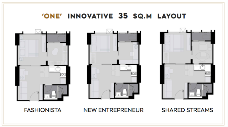 1 ห้องนอน โดดเด่นด้วยการจัดสรรพื้นที่อย่างลงตัวที่มีการแยกส่วนของห้องนั่งเล่น ห้องนอน และห้องอเนกประสงค์ อีกทั้งยังสามารถแยกใช้ หรือเชื่อมต่อด้วยประตูบานเลื่อนเพื่อความหลากหลายในการใช้สอยได้อีกด้วย
