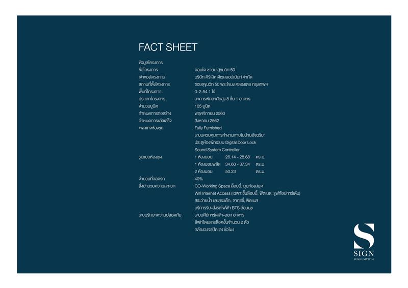 โครงการ “ซายน์ สุขุมวิท 50” (SIGN Sukhumvit 50) ตั้งอยู่ในซอยสุขุมวิท 50 บนพื้นที่โครงการประมาณ 0-2-54.1 ไร่ เป็นอาคารพักอาศัยสูง 8 ชั้น จำนวน 105 ยูนิต เป็นห้อง Fully Furnished พร้อมเข้าอยู่ มีให้เลือก 3 รูปแบบ ได้แก่