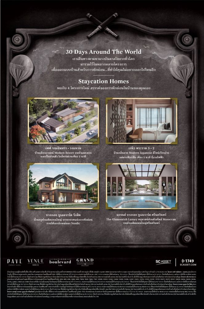นอกจากนี้ได้จัดทำภาพยนตร์โฆษณา ชื่อ “30 DAYS STAYCATION” เพื่อถ่ายทอดเรื่องราวแนวคิดการออกแบบบ้านซีรี่ส์ใหม่ที่ตอบโจทย์ human-centric พร้อมกับแรงบันดาลใจจากเมืองท่องเที่ยวทั่วโลกสู่วิถีการพักผ่อนมารวมไว้ในหลากหลายโครงการ ซึ่งเฟสแรกประกอบด้วยบ้านเดี่ยว 4 โครงการด้วยกัน ได้แก่ 2 โครงการใหม่ข้างต้น พร้อมกับโครงการแกรนด์บางกอก บูเลอวาร์ด ศรีนครินทร์ และ โครงการเวนิว พระราม 5-2 ซึ่งจากเฟสแรกของการเปิดตัว 2 โครงการนี้ ได้รับการตอบรับดีมาก สามารถทํายอดขายรวมกันถึง 600 ล้านบาท