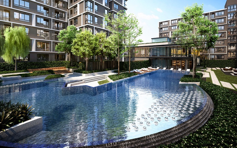 และนอกจากการสร้างความเชื่อมโยงในแง่มุมมองกับทะเลสาบภายนอกโครงการแล้ว พี้นที่ภายในโครงการ ยังถูกพัฒนาโดยการสร้างสระว่ายน้ำส่วนกลางฟอร์มธรรมชาติขนาดใหญ่ ให้เสมือนเป็นอีก Lake หนึ่งภายในโครงการ ที่สามารถใส่กิจกรรม Outdoor ต่างๆ เช่น Lap Pool , Kid's Pool , Sunken & Floating Deck , Jacuzzi Pool ฯลฯ โดยสามารถเชื่อมต่อมุมมองของห้องพักมายังสระว่ายน้ำฟอร์มธรรมชาตินี้ รวมถึงเชื่อมต่อกับอาคารส่วนกลางที่เป็น Library และ Smart Fitness ซึ่งอยู่ด้านบน.