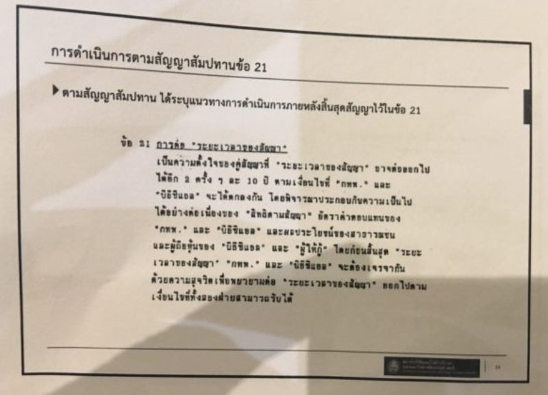ขณะเดียวกันในสัญญาสัมปทานข้อ 21 ระบุว่าการต่อสัญญากับบีอีเอ็ม อาจจะต่อได้อีก 2 ครั้ง ครั้งละ 10 ปี ตามที่เงื่อนไขของ กทพ.กับบีอีเอ็มจะตกลงกัน โดยพิจารณาประกอบกับความเป็นไปได้อย่างต่อเนื่องของสิทธิตามสัญญา อัตราค่าตอบแทนของ กทพ. และบีอีเอ็ม
