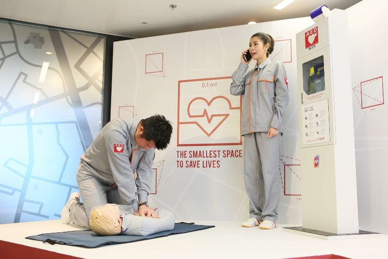 เพื่อช่วยชีวิตในเบื้องต้นของผู้ที่ประสบภาวะหัวใจหยุดเต้นเฉียบพลันก่อนส่งถึงมือแพทย์ ประกอบกับการสนับสนุนด้านข้อมูลพื้นฐานที่ได้รับจากพันธมิตรทางธุรกิจของเอพีอย่าง มิตซูบิชิ เอสเตท กรุ๊ป ซึ่งในประเทศญี่ปุ่นเครื่องช็อกไฟฟ้าหัวใจอัตโนมัติ AED