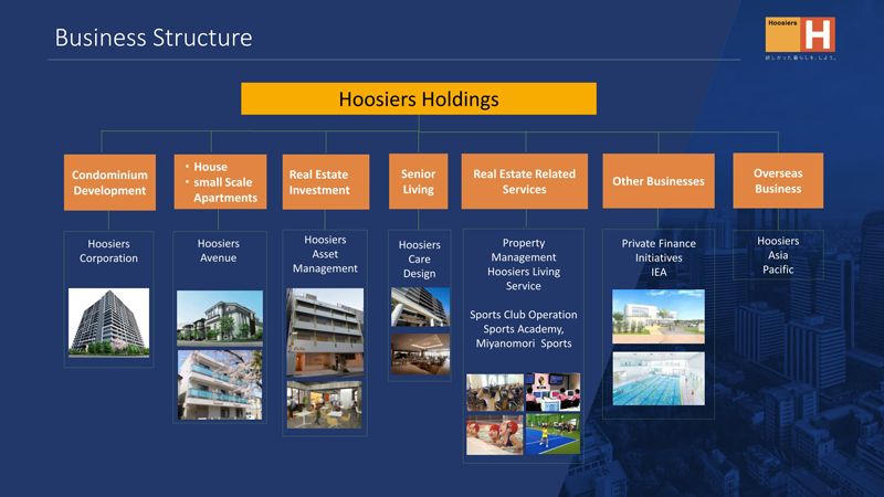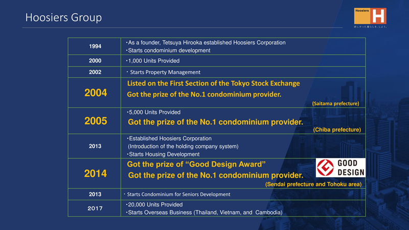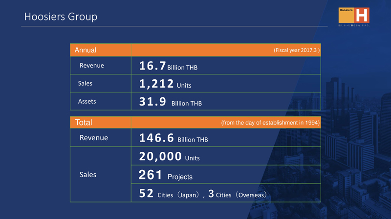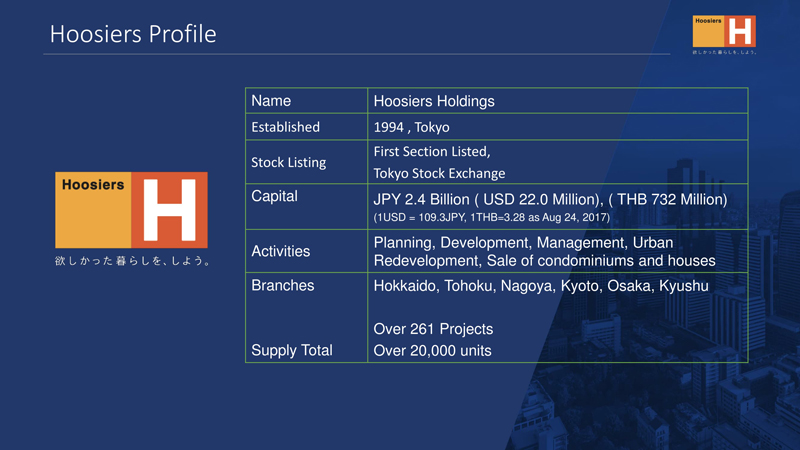 สำหรับ Hoosiers ถือเป็นบริษัทอสังหาดาวรุ่งพุ่งแรงที่ติด 1 ใน 10 ธุรกิจอสังหาฯของญี่ปุ่น ก่อตั้งมาแล้วตั้งแต่ 1994 มีมูลค่าโครงการที่ผ่านมาแล้วสูงถึง 146,000 ล้านบาท