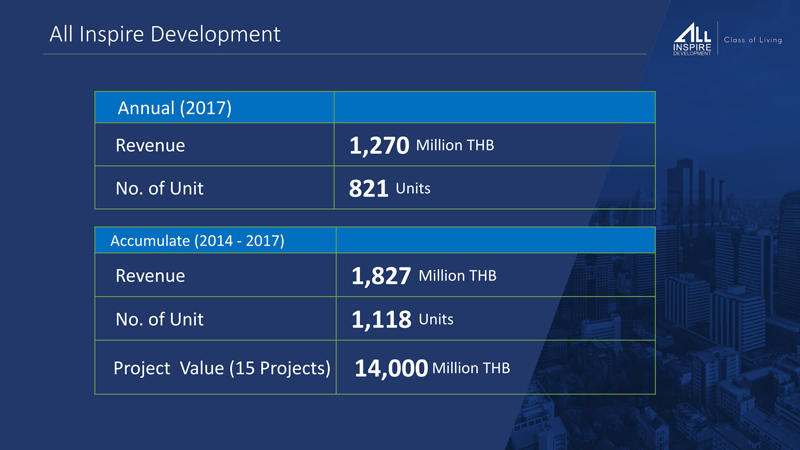 ดังนั้นถ้าร่วมทุนบริษัทที่ยังไม่เข้าตลาดหลักทรัพย์ น่าจะทำข้อตกลงต่างๆกันได้ง่ายและไวกว่า และอย่างที่เห็นกันล่ะครับว่า ถ้ามองหาบริษัทหน้าใหม่ที่ไฟแรงที่สุดในวงการอสังหาฯตอนนี้ ก็คงหนีไม่พ้น All Inspire ซึ่งเอาจริงๆแล้ว แม้จะยังไม่เข้าตลาด แต่ถ้าเรามาดูตัวเลข ก็ต้องบอกว่า All Inspire ทำตัวเลขผลประกอบการทั้งในปัจจุบันและอนาคตได้เหลือเชื่อมากๆ ซึ่งตัวเลขนี้มากกว่าบริษัทในตลาดหลักทรัพย์หลายบริษัทก็ว่าได้