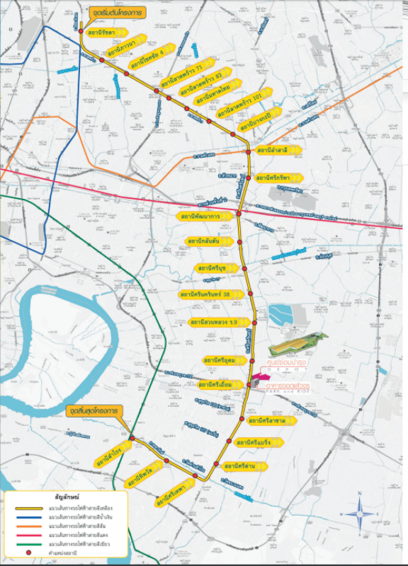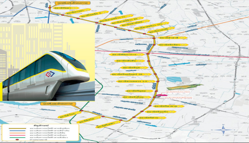 บริเวณทางแยกต่างระดับพระราม 9 และสายสีเขียว ช่วงแบริ่ง-สมุทรปราการ ที่สถานีสำโรง โครงการรถไฟฟ้าสายสีเหลืองเป็นแบบโมโนเรล หรือ รถไฟฟ้ารางเบาที่ขณะนี้ได้เริ่มลงมือขุดชั้นดินเพื่อดำเนินการก่อสร้างที่กำหนดเวลาการก่อสร้างกว่า 3 ปีและพร้อมเปิดให้บริการประชาชนได้ในช่วงปลายๆ ปี2563