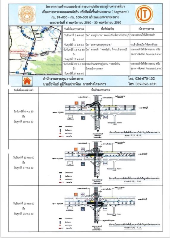วันที่ 13 – 17 พ.ย. 60 ปิดการจราจรบนทางหลัก ฝั่งขาเข้าสระบุรี โดยรถทางหลักให้ใช้ทางขนานหรือช่องทางพิเศษ (Reverse Lane) แทน