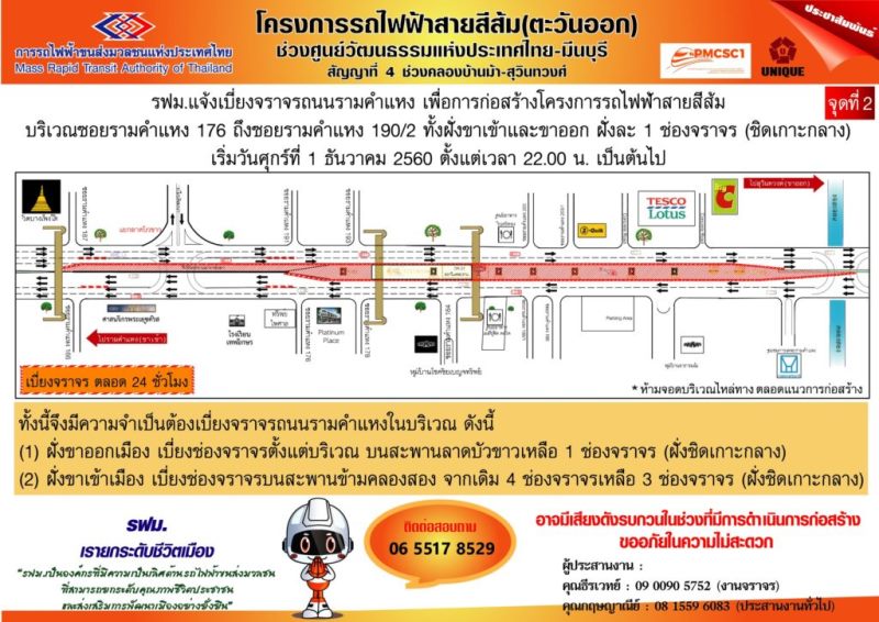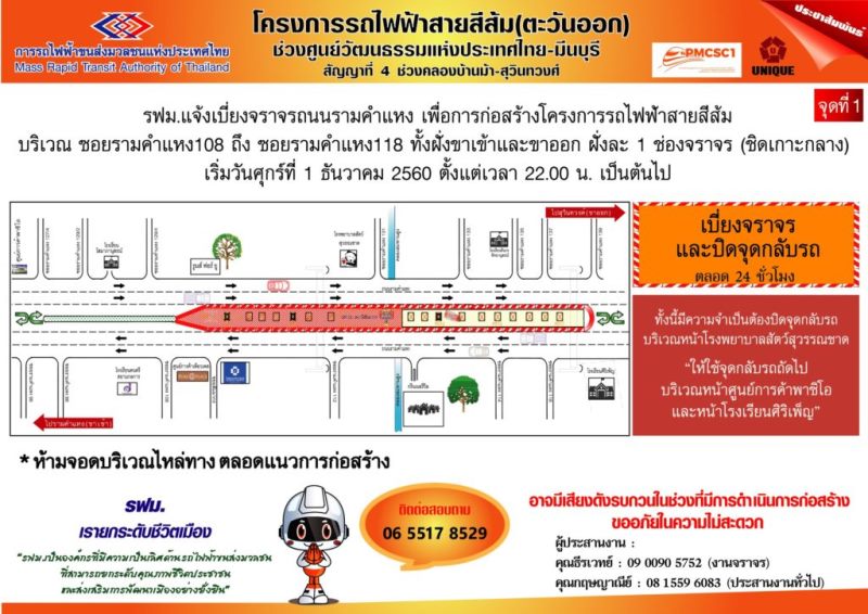 การรถไฟฟ้าขนส่งมวลชนแห่งประเทศไทย (รฟม.) แจ้งว่าบริษัท ยูนิค เอ็นจิเนียริ่ง แอนด์ คอนสตรัคชั่น จำกัด (มหาชน) ผู้รับจ้างก่อสร้างงานโยธา โครงการรถไฟฟ้าสายสีส้ม (ตะวันออก) ช่วงศูนย์วัฒนธรรมแห่ง ประเทศไทย – มีนบุรี สัญญา 4 จะดำเนินการเบี่ยงจราจรบริเวณเกาะกลางถนนรามคำแหง