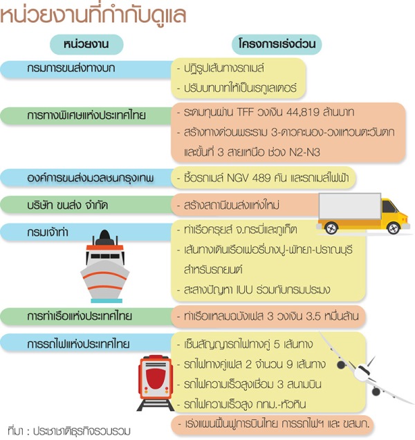 โดยงานของคมนาคมที่เป็นกระทรวงมีการลงทุนโครงสร้างพื้นฐานจำนวนมาก ทางอากาศต้องเร่งขยายสนามบินสุวรรณภูมิเฟส 2 และสนามบินอู่ตะเภา ทางถนนเพิ่มโครงข่ายมอเตอร์เวย์สายใหม่ รถไฟจะเร่งรัดสร้างทางคู่และรถไฟความเร็วสูง ส่วนทางน้ำมีพัฒนาท่าเรือแหลมฉบังเฟส 3 แนวทางการบริหาร “รถ-เรือ-ราง” ต่าง ๆ เป็นสิ่งที่กระทรวงทำอยู่และทำได้ดี แค่เร่งรัดให้สอดรับกับแนวคิดไทยแลนด์ 4.0 และอีอีซีที่เป็นนโยบายรัฐบาลและเรื่องใหญ่ในขณะนี้