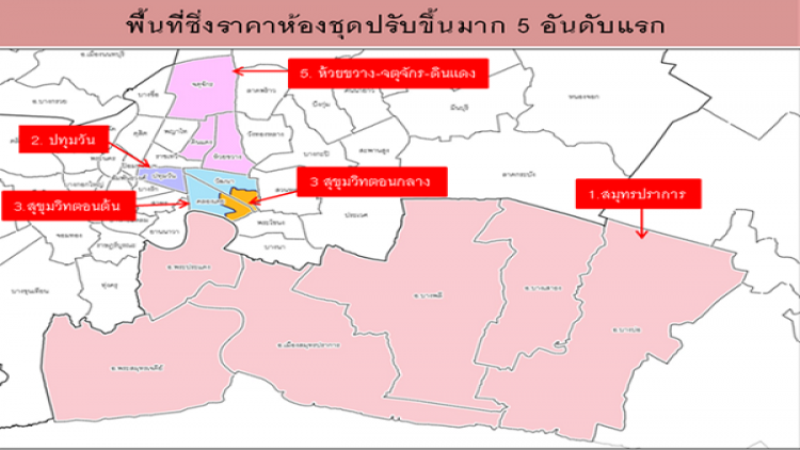 เขตปทุมวัน ราคาเพิ่มขึ้น 20.3% พื้นที่สุขุมวิทตอนกลาง เขตวัฒนาและเขตคลองเตย ราคาเพิ่มขึ้น 20% พื้นที่สุขุมวิทตอนต้น เขตวัฒนาและเขตคลองเตย ราคาเพิ่มขึ้น 18.2% พื้นที่ห้วยขวาง-จตุจักร-ดินแดง ราคาเพิ่มขึ้น 18%