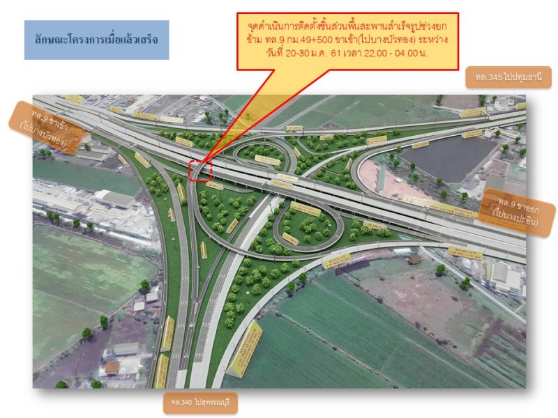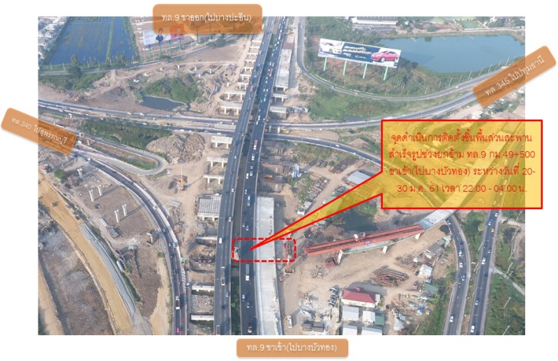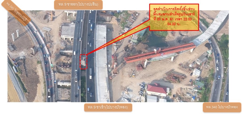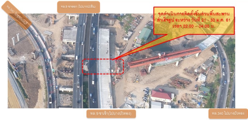 – วันที่ 21 – 30 มกราคม 2561 เวลา 22.00 น. – 04.00 น. ทำการติดตั้งชิ้นส่วนพื้นสะพาน ช่วงยกข้าม ทล.9 ขาเข้า (ไปบางบัวทอง) ปิดการจราจร 2 ช่อง เปิดการจราจร 1 ช่อง