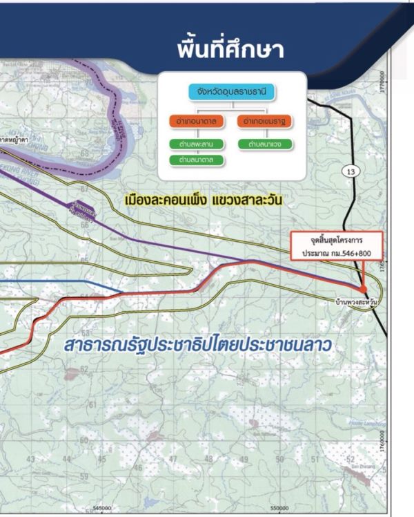 พื้นที่ศึกษาที่จังหวัดอุบลราชธานี ใน 2 อำเภอ ได้แก่ อำเภอนาตาล อำเภอเขมราฐ โดยแนวเส้นทางที่ได้รับการคัดเลือกและเหมาะสมของโครงการ มีจุดเริ่มต้นที่ กม.23+350 (บ้านโนนตาล ต.นาตาล อ.นาตาล) จุดสิ้นสุดที่ กม.546+800 (เมืองละคอนเพ็ง แขวงสาละวัน) รวมความยาวโดยประมาณ 25.8 กิโลเมตร