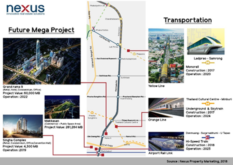 นอกจากนั้นยังมีแนวโน้มการขยายตัวของเมือง ในบริเวณนี้เพิ่มเติมจากโครงการ Mega Project ต่างๆ เช่น โครงการ Super Tower โครงการมักกะสัน รวมมูลค่าโครงการดังกล่าวทั้งสิ้นกว่า 340,000 ล้านบาท ทำเลนี้จึงมีความน่าสนใจหากต้องการคอนโดมิเนียมที่อยู่ใกล้ใจกลางเมือง เชื่อมต่อเข้าสู่ใจกลางเมืองได้เพียง 2 สถานี และแวดล้อมไปด้วยสิ่งอำนวยความสะดวก ในราคาที่ถูกกว่าคอนโดมิเนียมในแนวรถไฟฟ้าเส้นสุขุมวิท