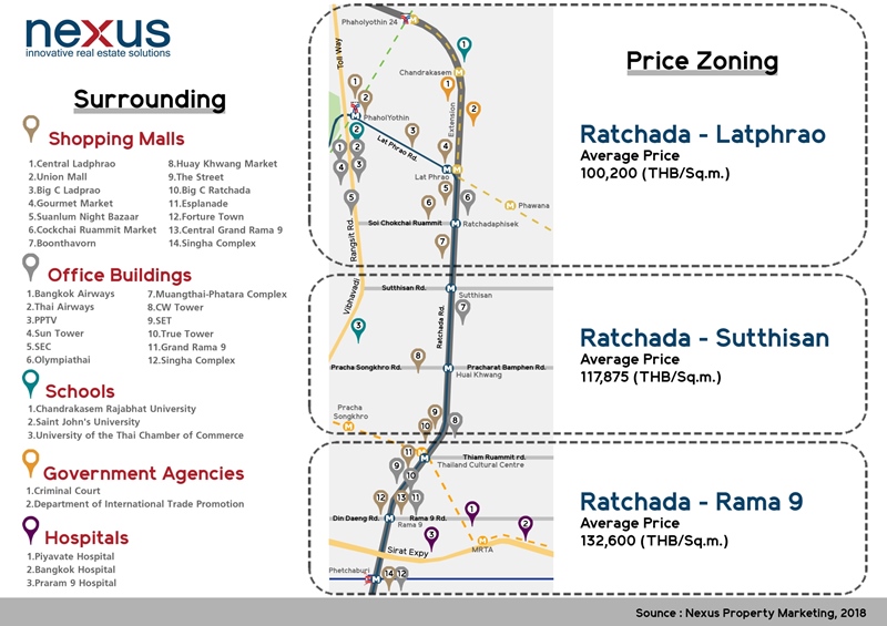 นางนลินรัตน์ เจริญสุพงษ์ กรรรมการผู้จัดการ บริษัท เน็กซัส พรอพเพอร์ตี้ มาร์เก็ตติ้ง จำกัด กล่าวว่า “ถนนรัชดาภิเษก เชื่อมต่อถนนหลักสำคัญหลายเส้นทาง ไม่ว่าจะเป็นถนนลาดพร้าว ถนนสุทธิสาร และถนนพระราม 9 ถนนทั้ง 3 เส้นที่ตัดผ่าน ทำให้พื้นที่ดังกล่าวมีลักษณะเฉพาะที่แตกต่างกัน ทั้งในแง่ของการกระจุกตัวของที่อยู่อาศัย ออฟฟิศ ศูนย์การค้า