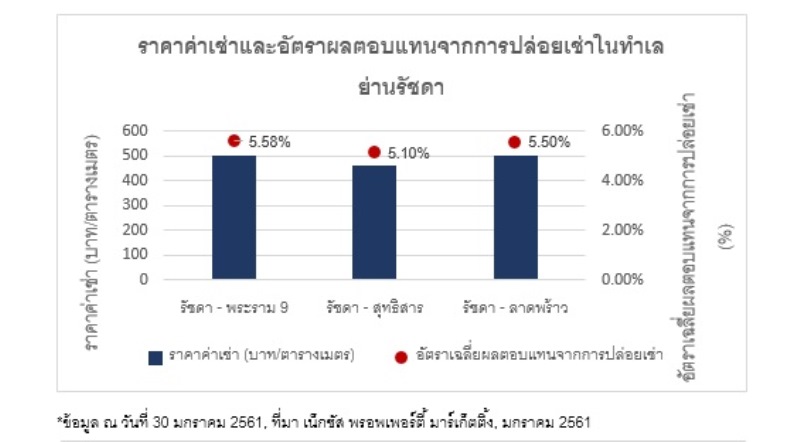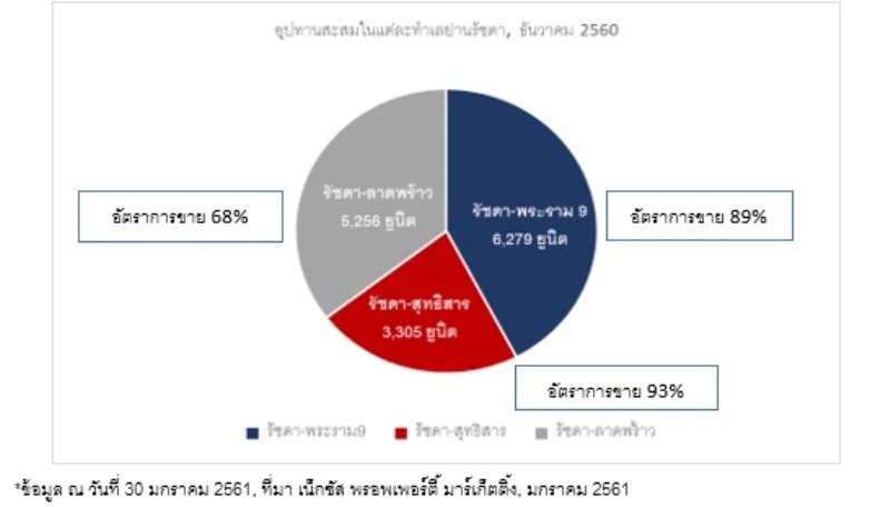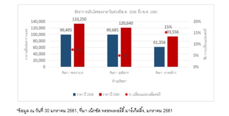 ซึ่งปัจจัยดังกล่าวข้างต้นยังสะท้อนไปถึงราคาอสังหาริมทรัพย์ในพื้นที่นั้นๆ ด้วย ทั้งนี้ทำเลรัชดาภิเษกครอบคลุมจาก (1) โซนรัชดา-พระราม 9 (2) โซนรัชดา-สุทธิสาร และ (3) โซนรัชดา-ลาดพร้าว ในด้านการอยู่อาศัย ความโดดเด่นของ 3 ทำเลนี้ สามารถตอบสนองได้ทั้งการใช้ชีวิต การทำงาน และการเดินทางที่สะดวกสบายด้วยระบบราง ในด้านราคานั้น ทำเลนี้มีอัตราการเติบโตของราคาในช่วง 5 ปีที่ผ่านมา เฉลี่ยอยู่ที่ 9.3% ต่อปี จากราคาเฉลี่ย 86,900 บาทต่อตารางเมตร ในปี 2556 ต่อเป็น 116,000 บาทต่อตารางเมตร ในปี 2560”