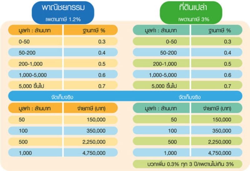 ประเภทพาณิชยกรรมและอุตสาหกรรม มูลค่า 50 ล้านบาท เสียภาษีปีละ 1.5 แสนบาท, มูลค่า 100 ล้านบาท เสียภาษี 3.5 แสนบาท, มูลค่า 500 ล้านบาท เสียภาษี 2.25 ล้านบาท, มูลค่า 1,000 ล้านบาท เสียภาษี 4.75 ล้านบาท