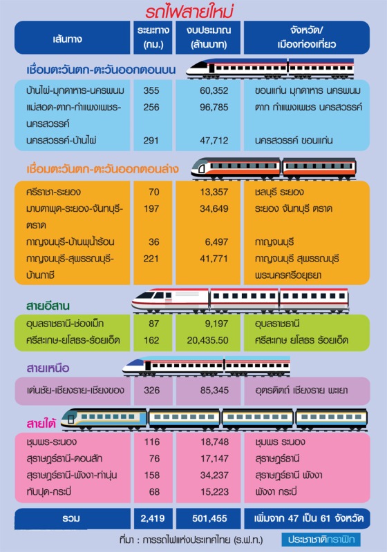 ขณะนี้อยู่ในช่วงการเตรียมงบประมาณของปี 2562 ขอเน้นการสร้างเส้นทางรถไฟสายหลัก ทั้งรถไฟความเร็วสูงกรุงเทพฯ-ระยอง รถไฟทางคู่สายใหม่ รถไฟเพื่อการท่องเที่ยวจากเมืองใหญ่ไปเมืองรอง สร้างการเข้าถึงท้องถิ่น และภูมิภาค