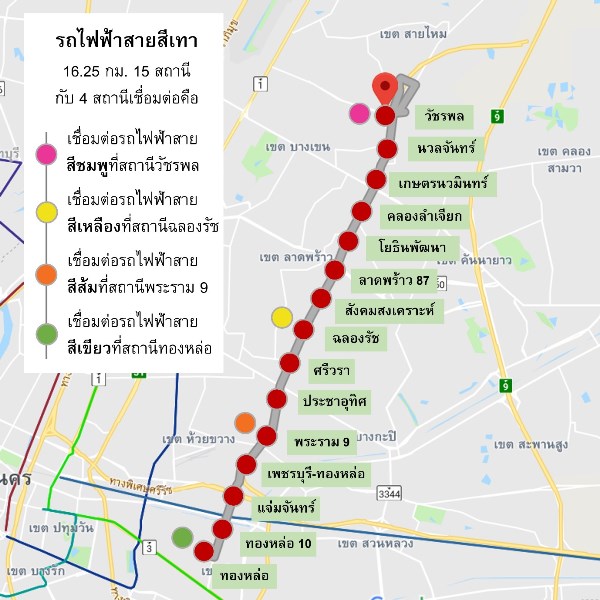 รถไฟฟ้าสายสีเทา วัชรพล-ทองหล่อ สำหรับรถไฟฟ้าสายสีเทาที่แบ่งออกเป็น 3 ช่วง รวมระยะทาง 39.91 กม. 39 สถานี ได้แก่ ช่วงที่ 1 วัชรพล-ทองหล่อ ช่วงที่ 2 พระโขนง-พระราม 3 และช่วงที่ 3 พระราม 3-ท่าพระ