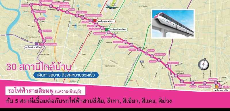 รถไฟฟ้าสายสีชมพู แคราย-มีนบุรี รวมระยะทาง 34.5 กม. 30 สถานี เริ่มตั้งแต่มีนบุรีไปตามถนนรามอินทรา จนถึงวัดพระศรีมหาธาตุบางเขน ไปยังหลักสี่ แจ้งวัฒนะ ศูนย์ราชการ ปากเกร็ด และสิ้นสุดที่แยกแคราย