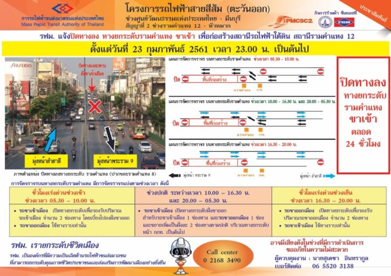 โดยมีความจำเป็นต้องปิดทางลงทางยกระดับรามคำแหง ขาเข้า ซอยรามคำแหง 8 เพื่อก่อสร้างสถานีรามคำแหง 12 เริ่มปิดตั้งแต่วันที่ 23 กุมภาพันธ์ 2561 เวลา 23.00 น. เป็นต้นไป