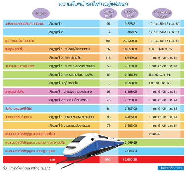 เดินเครื่องก่อสร้างตั้งแต่ต้นปี 2559 สำหรับโครงการรถไฟทางคู่เฟสแรก จำนวน 7 เส้นทาง ระยะทางรวม 993 กม. ที่ “ร.ฟ.ท.-การรถไฟแห่งประเทศไทย” ใช้เงินก่อสร้าง 113,660 ล้านบาท