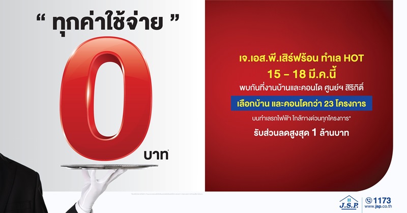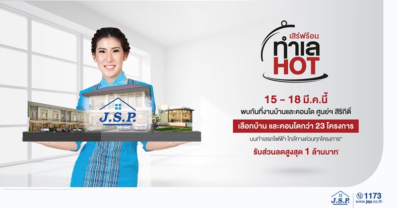 บริษัท เจ.เอส.พี. พร็อพเพอร์ตี้ จำกัด (มหาชน) หรือ JSP ยกขบวนสินค้าบ้านดีราคาคุณภาพทั้ง 23 โครงการใน 10 ทำเลทอง ออกบูธงานมหกรรมบ้านและคอนโด ครั้งที่ 38 ระหว่างวันที่ 15 - 18 มีนาคม 2561 นี้ พร้อม จัดโปรโมชั่นใหญ่ 0 บาททุกค่าใช้จ่าย ส่วนลดเป็นล้านสู้ศึก แย้มตั้งเป้ายอดจองในงานไม่ต่ำกว่า 80 ล้านบาท