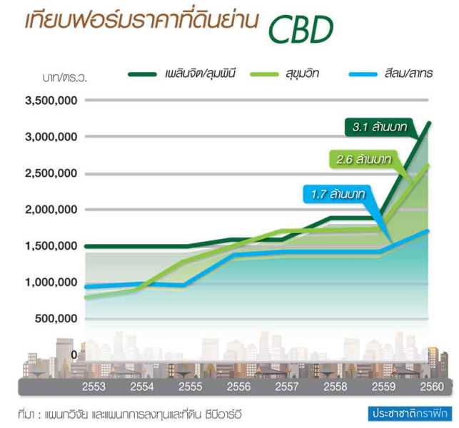 ทำให้ประเมินแนวโน้มภาวะราคาที่ดินปีนี้ ทำเลย่านซีบีดี หรือย่านศูนย์กลางธุรกิจใกล้แนวรถไฟฟ้า จะปรับตัวเพิ่มขึ้นต่อเนื่อง โดยอัตราการเพิ่มขึ้นในปี 2560 บางแปลงสูงถึง 25-30%