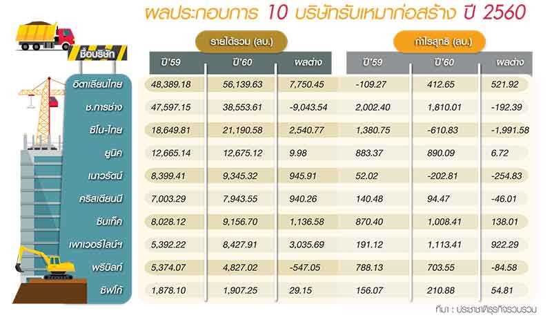 “ประชาชาติธุรกิจ” รวบรวมผลประกอบการของ 10 บริษัทรับเหมาก่อสร้างที่จดทะเบียนในตลาดหลักทรัพย์แห่งประเทศไทย