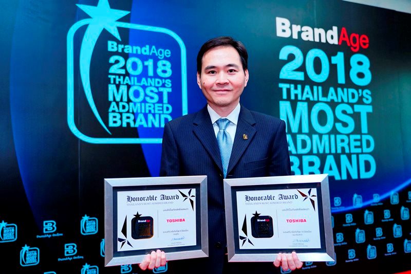 นายบุนยรัตน์ ไตรสิริสมบัติ ผู้จัดการกลุ่มผลิตภัณฑ์เครื่องใช้ไฟฟ้าภายในบ้าน บริษัท โตชิบา ไทยแลนด์ จำกัด ขึ้นรับรางวัล Thailand’s Most Admired Brand 2018 ในหมวดสินค้าเครื่องซักผ้า และตู้เย็น ซึ่งโตชิบาได้ครองแชมป์ความเป็นหนึ่งในใจผู้บริโภคเกือบ 10 ปี การันตีความเป็นสินค้าคุณภาพโดดเด่นด้านการประหยัดพลังงาน ดีไซน์สวยงามทันสมัย รวมถึงการรับประกันสินค้าและบริการหลังการหลังการขาย จากนิตยสารแบรนด์เอจ นิตยสารด้านการตลาดอันดับหนึ่งของประเทศไทย ผ่านการสำรวจจากกลุ่มตัวอย่างทั่วประเทศ เมื่อเร็วๆ นี้