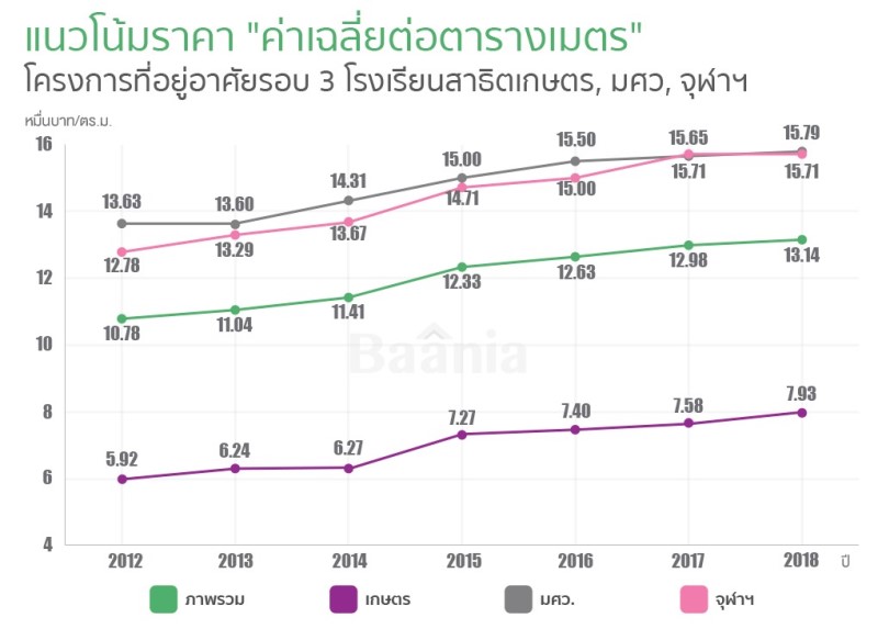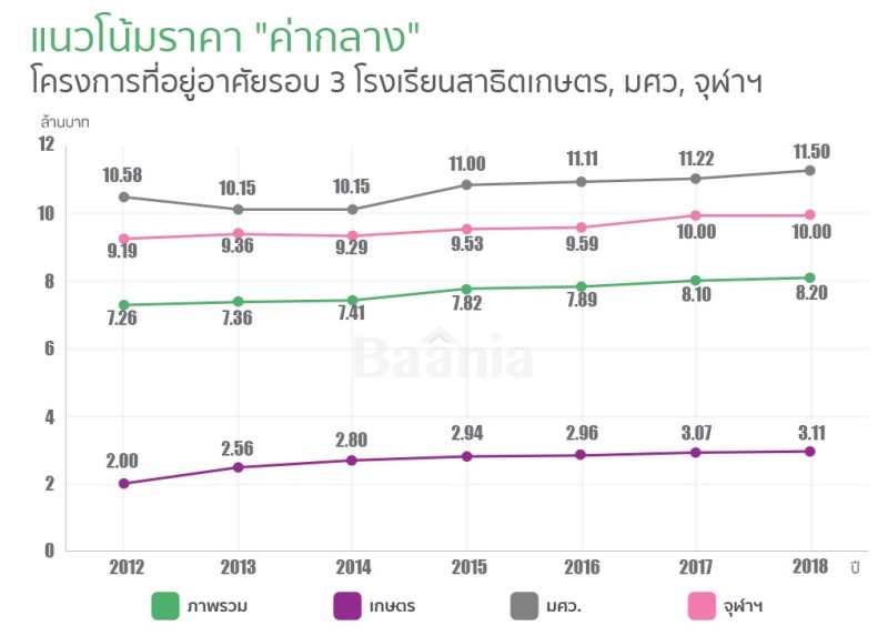 สำหรับแนวโน้มของราคาที่อยู่อาศัยโดยรอบโรงเรียนสาธิตทั้ง 3 แห่ง โดยภาพรวมค่ากลางราคาขายของทั้ง 3 พื้นที่จากการสำรวจตั้งแต่ปี 2012-2018 ยังมีแนวโน้มที่เพิ่มขึ้นอย่างต่อเนื่อง
