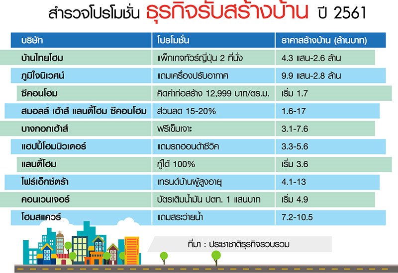 บริษัท บ้านไทยโฮม จัดโปรฯทำสัญญาสร้างบ้านเริ่ม 4.3 แสนบาท รับตั๋วเครื่องบินเที่ยวญี่ปุ่น 2 ที่นั่ง บริษัท คอนเวนเจอร์ แถมบัตรเติมน้ำมันในปั๊ม ปตท. 1 แสนบาท, บริษัท โฮมสแควร์ดีเวลอปเม้นท์ แถมสระว่ายน้ำ สำหรับออร์เดอร์สร้างบ้านราคา 5-10.5 ล้านบาท