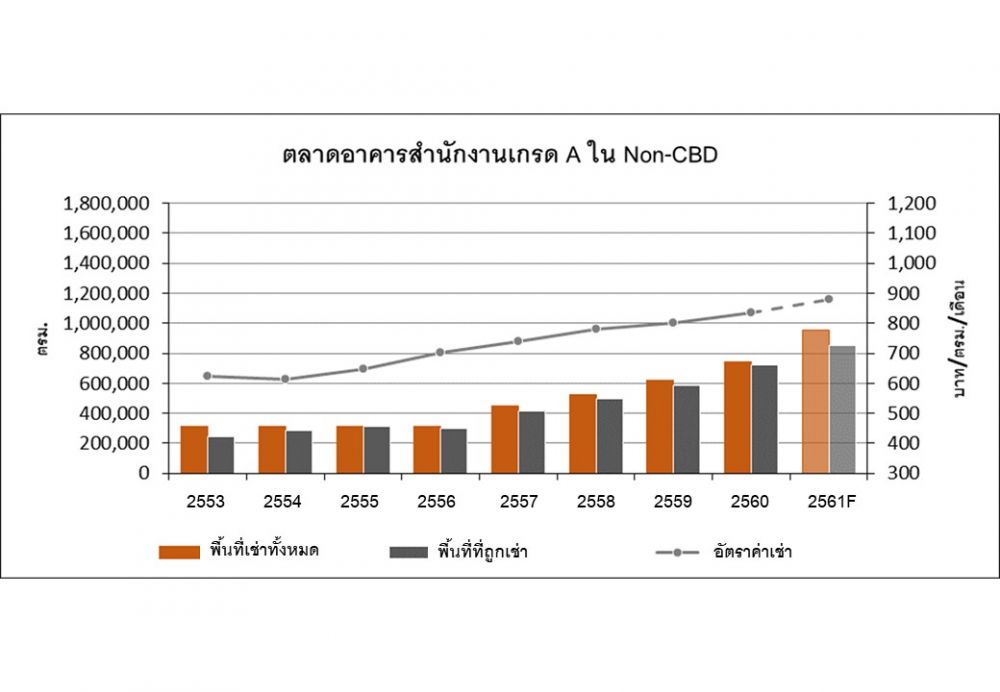 พื้นที่อาคารสำนักงานในช่วงไตรมาสแรกของปี 2561 มีพื้นที่ให้เช่าทั้งสิ้นประมาณ 4.23 ล้านตารางเมตร ในจำนวนนี้อยู่ในเขตศูนย์กลางธุรกิจประมาณ 2.29 ล้านตารางเมตร โดยกว่าครึ่งหนึ่งของพื้นที่เช่าในเขตศูนย์กลางธุรกิจนี้เป็นพื้นที่สำนักงานเกรด A ทั้งนี้ พื้นที่การพัฒนาอาคารสำนักงานมีการขยายตัวเป็นวงกว้างมากขึ้น โดยจะเห็นได้ว่าในไม่กี่ปี ที่ผ่านมา พื้นที่อาคารสำนักงานในเขตรอบนอกศูนย์กลางธุรกิจเพิ่มขึ้นกว่าเท่าตัว