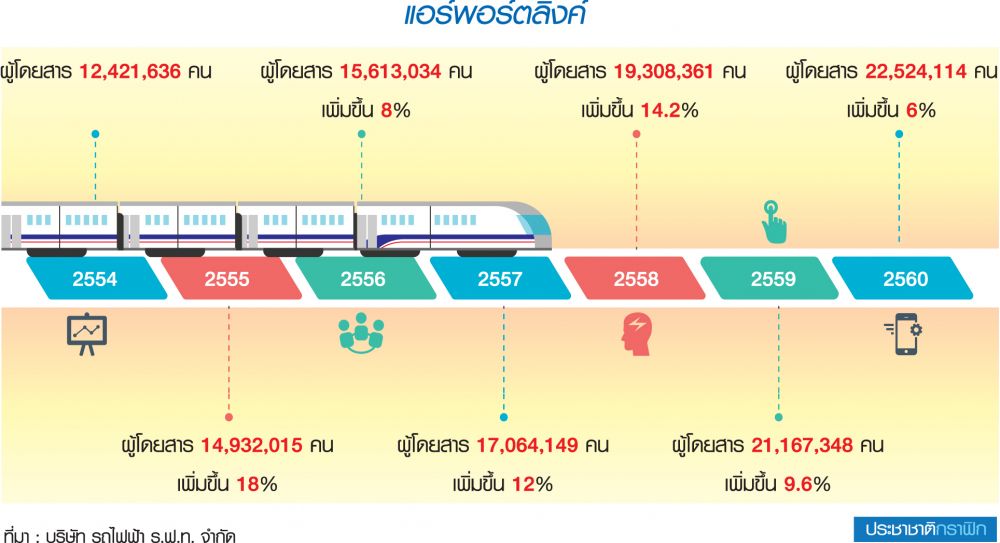 กว่า 8 ปีที่ “แอร์พอร์ตเรลลิงก์” รถไฟฟ้าเชื่อมสนามบินสุวรรณภูมิเปิดให้บริการ นับจากวันที่ 23 ส.ค. 2553 มีบริษัท รถไฟฟ้า ร.ฟ.ท. จำกัด หรือ รฟฟท. บริษัทลูกของการรถไฟแห่งประเทศไทย (ร.ฟ.ท.) เป็นผู้รับจ้างบริหารโครงการ ปัจจุบันมีผู้โดยสารแตะ 7.8 หมื่นเที่ยวคนต่อวัน