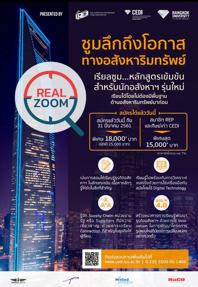 เรียนเชิญทุกท่านที่สนใจในธุรกิจอสังหาริมทรัพย์ซึ่งได้ออกแบบและจัดทำหลักสูตรเรียนลัดอสังหาริมทรัพย์เอาเฉพาะสิ่งสำคัญและจำเป็นที่จะทำให้ผู้เข้าอบรมสามารถรอบรู้ปัจจัยสำคัญได้ภายใน 5 วันและพร้อมให้คำปรึกษาต่อเนื่องจนสามารถจัดตั้งธุรกิจได้ เป็นความร่วมมือของสมาคมการค้าอสังหาริมทรัพย์และพันธมิตรร่วมกับมหาวิทยาลัยกรุงเทพจัดทำหลักสูตรนี้ขึ้นมาคะ