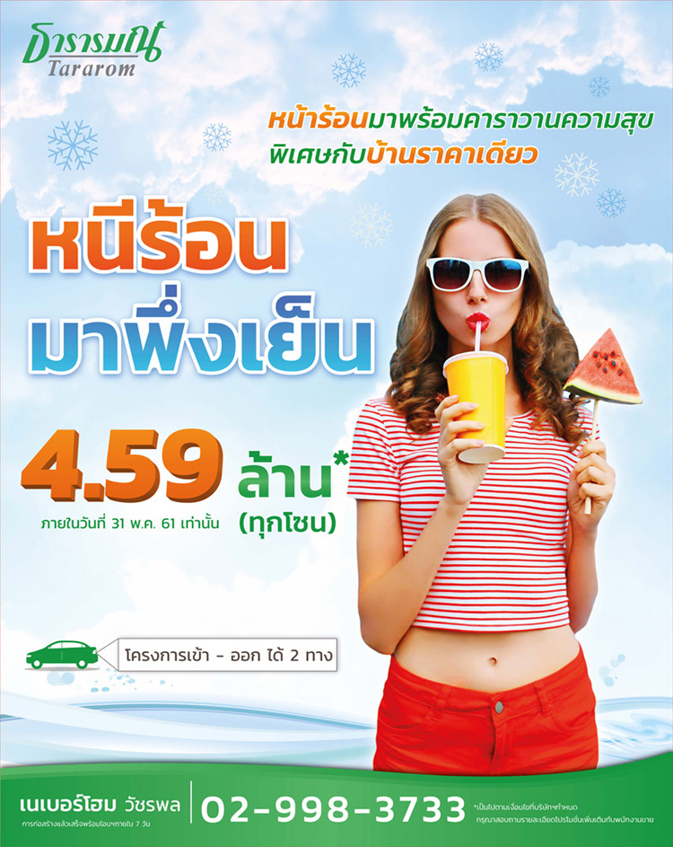 นายณัฐพล มัททวกุล ผู้ช่วยกรรมการผู้จัดการ สายงานการตลาด บริษัท ธารารมณ์ เอ็นเตอร์ไพรส์ จำกัด (มหาชน) เปิดเผยถึงโปรโมชั่นช่วงหน้าร้อนมาพร้อมคาราวานความสุข มอบความพิเศษให้ลูกค้าด้วยขบวนบ้านเดี่ยวกับความหลากหลายทั้งแบบบ้าน ทำเล พื้นที่ใช้สอยและพื้นที่ดิน จัดโปรโมชั่น “Super Summer Fest” บ้านเดี่ยวราคาเดียวในแต่ละโครงการ ให้ลูกค้าได้เลือกบ้านที่ตรงใจและราคาโดนใจกับบ้านเดี่ยว Irina ราคาเดียวสุทธิ 4.59 ล้านบาททุกโซน