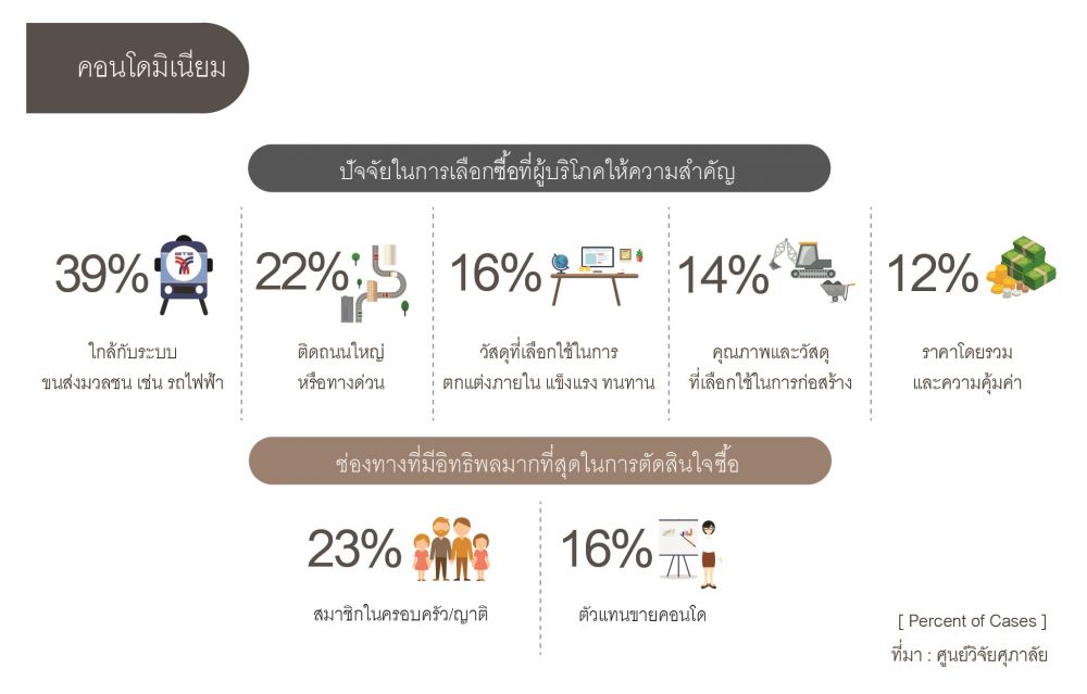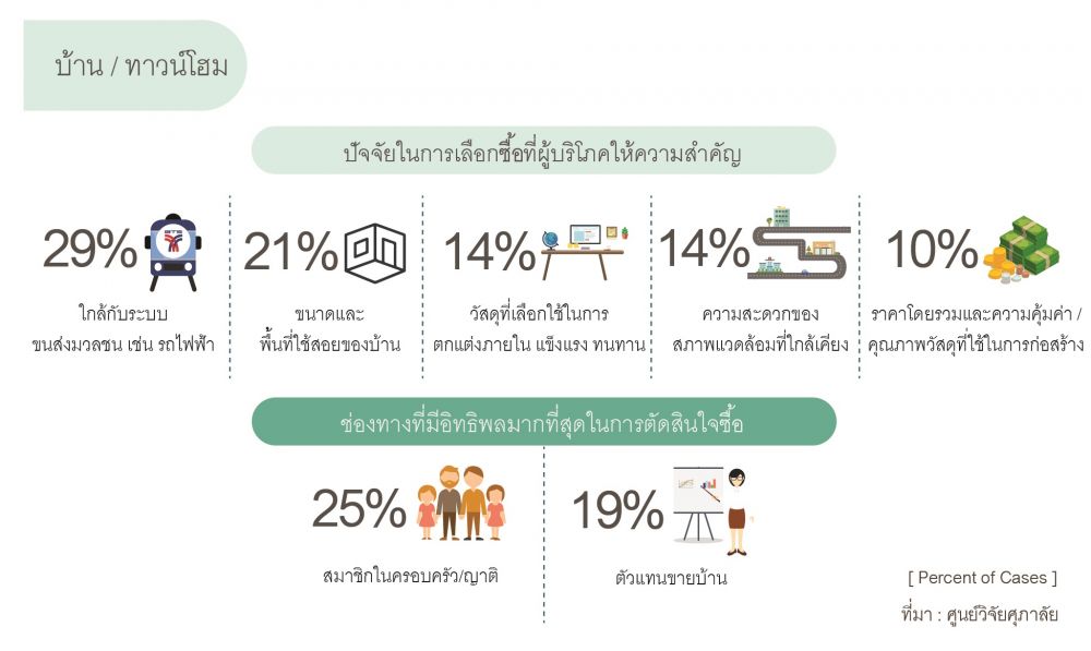 ศูนย์วิจัยฯ ศุภาลัย ได้สำรวจผู้บริโภคเกี่ยวกับพฤติกรรมการเลือกซื้อที่อยู่อาศัยทั้งคอนโดมิเนียมและบ้าน/ทาวน์โฮม ในกรุงเทพฯและปริมณฑล ปัจจัยในการเลือกซื้อที่อยู่อาศัยที่ผู้บริโภคให้ความสำคัญไม่ว่าจะเป็นคอนโดมิเนียมและบ้าน/ทาวน์โฮม คือ ทำเลที่ตั้งอยู่ใกล้กับระบบขนส่งมวลชน , วัสดุที่เลือกใช้ในการตกแต่งภายในมีความแข็งแรงคงทน , คุณภาพและวัสดุที่ใช้ในการก่อสร้าง , ราคาโดยรวมและความคุ้มค่า ตามลำดับ