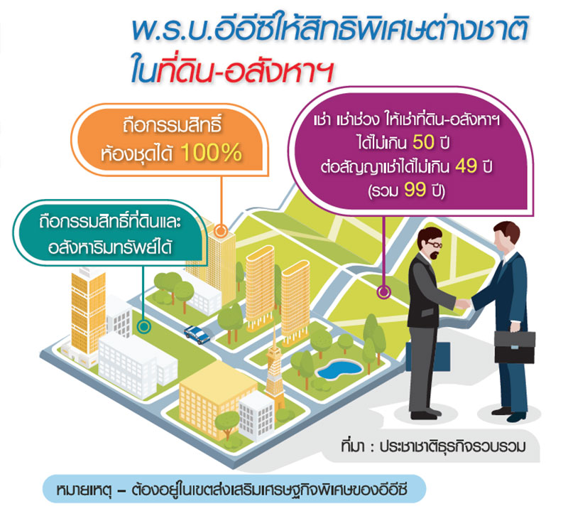 โดย พ.ร.บ.EEC กำหนดให้คนต่างด้าวและนิติบุคคลต่างด้าวในพื้นที่ 3 จังหวัด EEC คือ ชลบุรี ระยอง และฉะเชิงเทรา ได้สิทธิพิเศษเกี่ยวกับที่ดินและอสังหาฯ ดังนี้ 1.ให้ผู้ประกอบกิจการในเขตส่งเสริมเศรษฐกิจพิเศษ ซึ่งเป็นนิติบุคคลและเป็นคนต่างด้าวตามประมวลกฎหมายที่ดิน มีสิทธิถือกรรมสิทธิ์ในที่ดินภายในเขตส่งเสริมฯ เพื่อประกอบกิจการที่ได้รับอนุญาตได้ โดยไม่ต้องได้รับอนุญาตตามประมวลกฎหมายที่ดิน