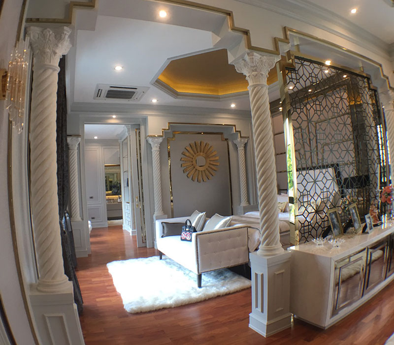 เอกสิทธิ์ของการเป็นบ้านหรู คือต้องมีเพดานสูงกว่าปกติ ชั้นบนกับชั้นล่างสูง 5.5-6.5 เมตร มีสระขนาด 5×12 เมตร กลางวงโอบล้อม 3 ด้านของตัวบ้าน โดยมีการติดตั้งชุดสปาและสุขภัณฑ์ของ Amani Roca อย่างทั่วถึงในบ้านเป็นครั้งแรก คำนวณราคาเห็นเบาะ ๆ ชุดละ 2 ล้านบาท