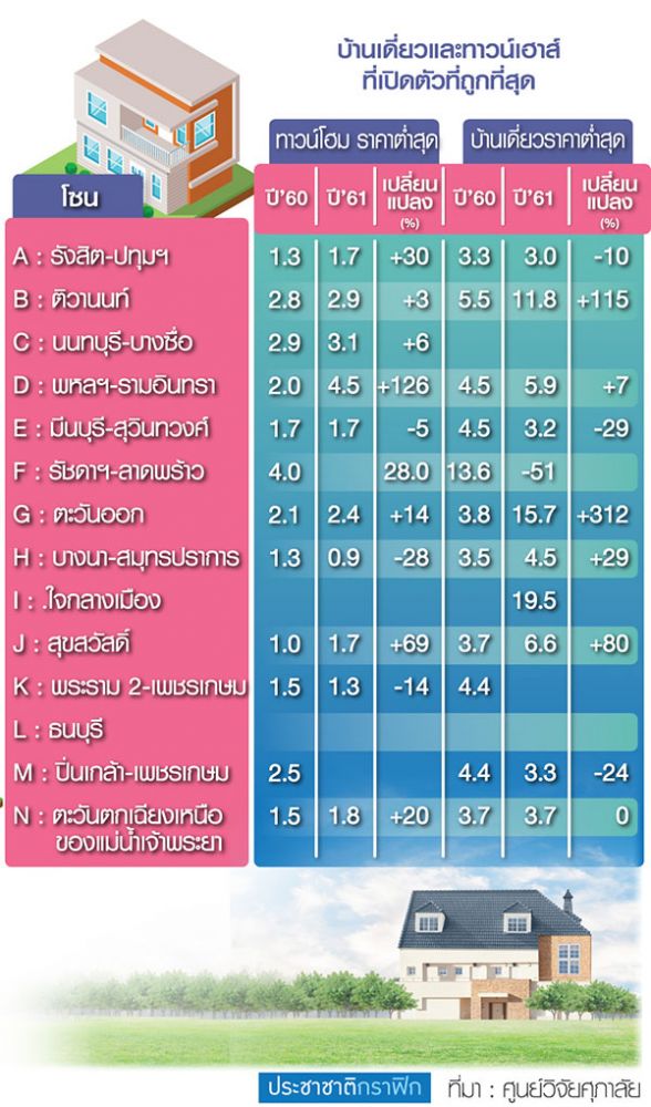 ทั้งนี้ สิ่งที่กล่าวมาข้างต้นไม่ได้หมายความว่าเป็นแนวโน้มของสินค้าโดยทั่วไปทั้งตลาด แต่เป็นเพียงแนวโน้มของสินค้าเกิดใหม่เท่านั้นบางส่วนของตลาดยังคงนำเสนอสินค้าแก่ผู้ที่มีรายได้น้อยในราคาที่ต่ำที่สุดเท่าที่กฎหมายปัจจุบันจะอำนวยให้ทำได้ และสินค้าที่มีราคาต่ำสุดนี้ยังมีแนวโน้มปรับราคาลดลงด้วยในระหว่างปี 2560 และ 2561 ดังที่แสดงในรูปที่ 1 บ้านเดี่ยวที่ราคาต่ำที่สุดมาจากโซน “รังสิต-ปทุมฯ” ส่วนทาวน์เฮาส์ที่ราคาถูกที่สุดมาจากโซน “บางนา-สมุทรปราการ” ในปี 2561 จากเดิมเจ้าของสถิติอยู่ในโซน “สุขสวัสดิ์” ในปี 2560