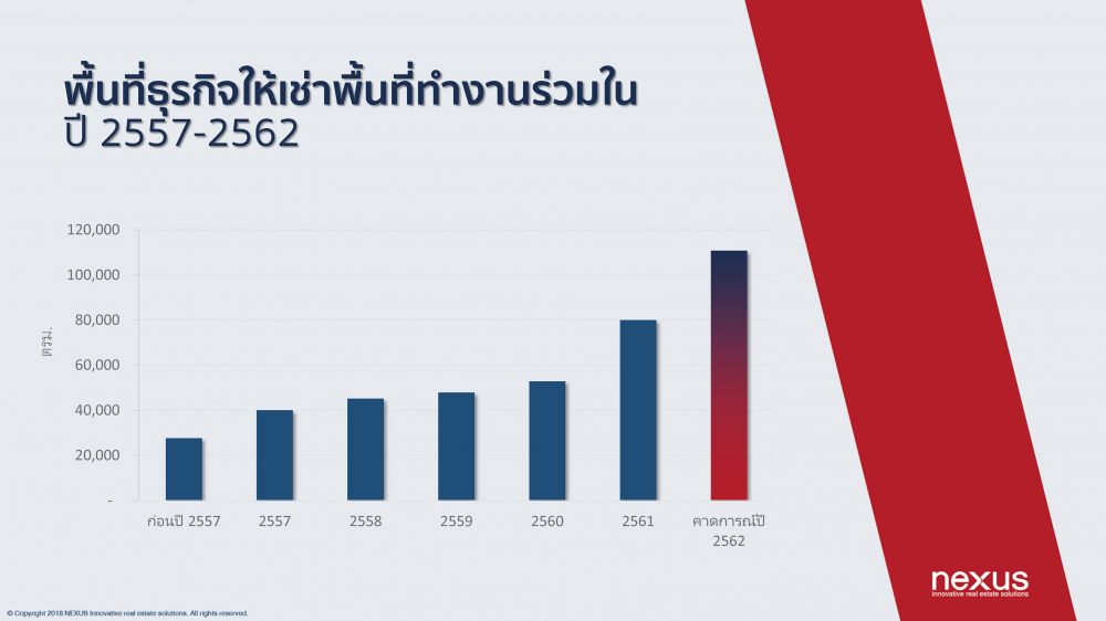 นายธีระวิทย์ ลิ้มทองสกุล กรรมการผู้จัดการบริษัท เน็กซัส เรียลเอสเตท แอ็ดไวเซอรี่ เผยว่า “ปัจจุบันธุรกิจให้เช่า Co-working Office กำลังได้รับความนิยมเป็นอย่างมาก พบว่าในปี 2018 ตลาด Co-working Office มีการเปิดให้บริการเพิ่มมากขึ้นกว่าปีที่ผ่านมา (2017) ถึง 51% บนพื้นที่กว่า 100,000 ตารางเมตร หรือคิดเป็น 2.6% ของพื้นที่เช่าอาคารสำนักงานแบบดั้งเดิม