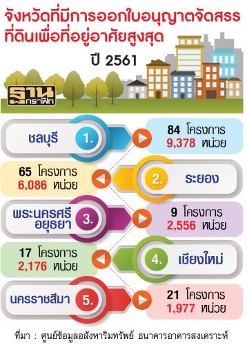 หากลงลึกในรายจังหวัดที่มีการออกใบอนุญาตก่อสร้างที่อยู่อาศัย ชลบุรีก็ยังนำมาอันดับ 1 ในสัดส่วน 11.7% (เป็นแนวราบ 15,795 หน่วย อาคารชุด 2,961 หน่วย) รองลงมานครราชสีมา 8.5% (แนวราบ 15,795 หน่วย อาคารชุด 2,961 หน่วย)