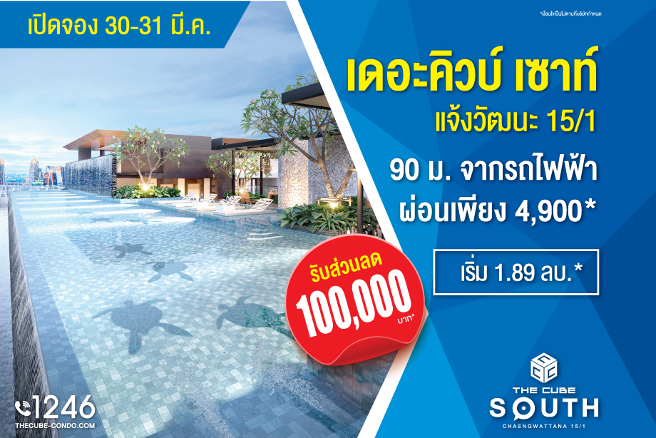 พัฒนาและบริหารงานโดย บริษัท คิวบ์ เรียล พร็อพเพอร์ตี้ จำกัด พร้อมจัดงานฉลองเปิด Pre Sale ในวันที่ 30 – 31 มีนาคม 2562 ณ สำนักงานขาย The Cube South Chaengwattana มีขนาดห้องตั้งแต่ 25.5 – 43 ตารางเมตร ราคาเริ่มต้น 1.89 ล้านบาท* พร้อมเครื่องปรับอากาศ (Air Conditioner) และเฟอร์นิเจอร์คุณภาพสูงครบทุกฟังก์ชั่น (Fully Furnished) ดีไซน์มาพิเศษเฉพาะโครงการฯ จากแบรนด์ STARMARK ฟรีทุกยูนิต เริ่มผ่อนเพียง 4,900 บาท/เดือน*